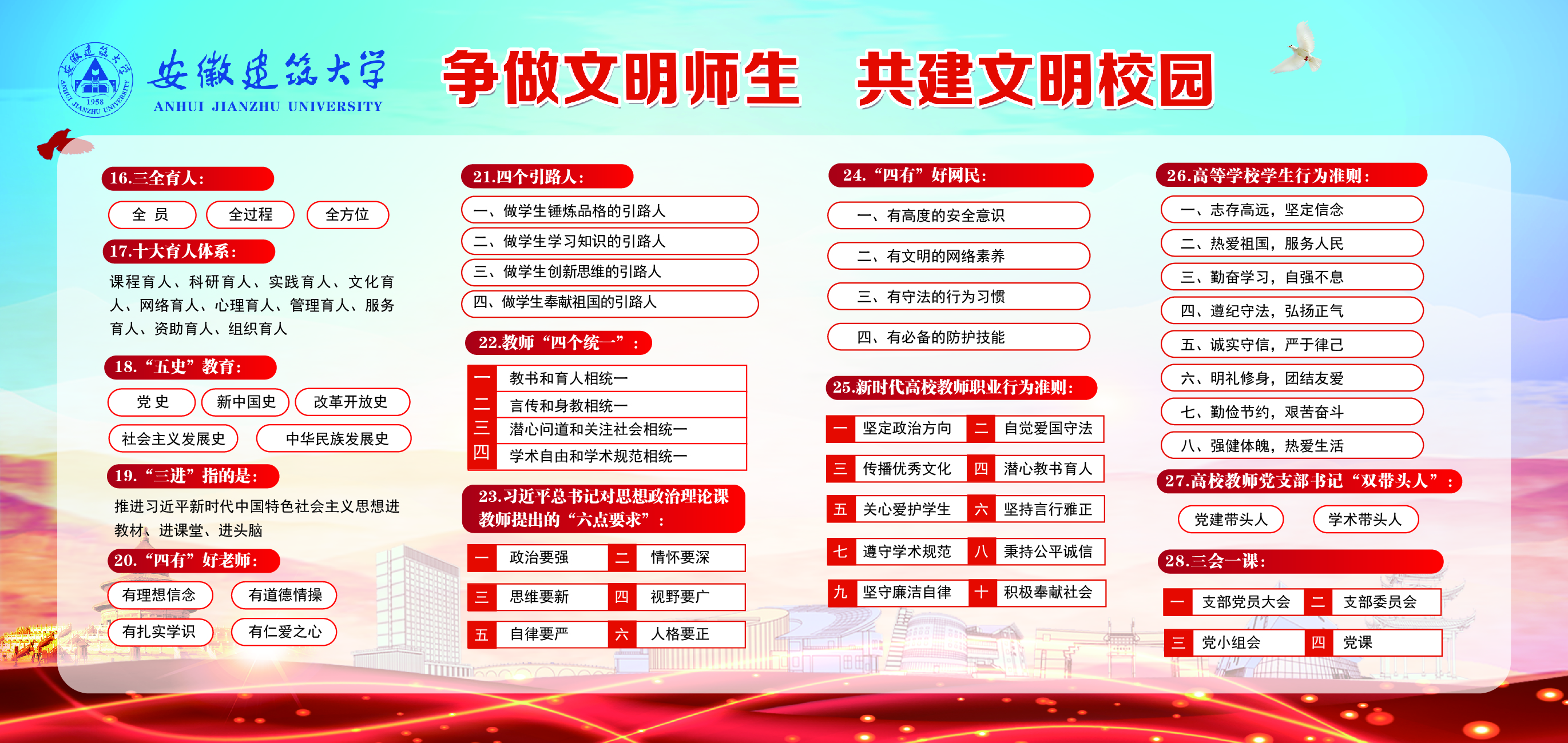 编者按:当前,beat365官网正在积极开展文明校园创建,这是提升校园文明程度、提高校园文化建设水平、促进师生共享校园文明创建成果的重要契机。“争做文明师生,共建文明校园”是每一名建大师生义不容辞的责任和义务,需要全体建大人共同参与和努力。这些关于文明创建知识你了解多少,赶快来学习吧!