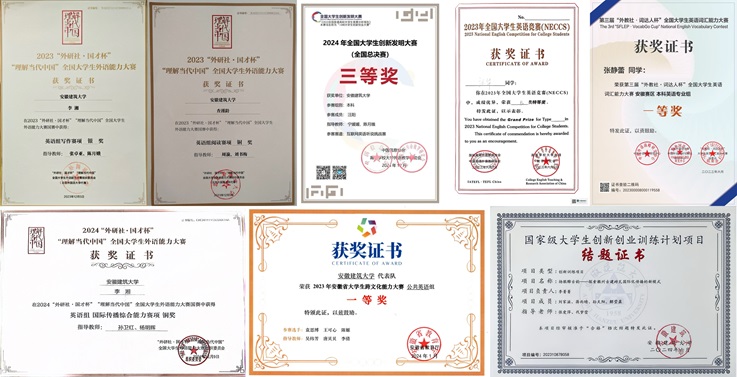 近年来,英语专业紧扣“语言+文化+实践”复合型人才培养目标,整合优质资源、强化赛教融合,师生协同奋进,在各类学科竞赛中屡获佳绩。学生在国家级、省级大学生创新创业项目中立项十余项,依托“徽州古建筑国际化传播”等课题,以语言为桥探索文化传承与国际表达新路径,彰显专业实践创新活力。在语言技能类赛事中,累计斩获“外研社・国才杯”“理解当代中国”全国大学生外语能力大赛写作、阅读大赛国家级奖项3项,并在全国大学生英语竞赛中获得高等级奖项,展现扎实语言功底与国际传播能力。跨文化与实践创新领域,学生团队在安徽省大学生跨文化能力大赛中连续3年蝉联团队一等奖,于多元文化交流中尽显沟通素养;此外,在“挑战杯”全国大学生课外学术科技作品竞赛、“全国大学生创新发明大赛”等综合赛事中实现突破。