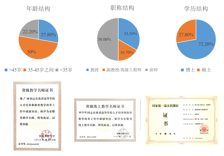 本专业已形成了一支年龄结构合理、学术水平和教学水平高、科研能力强的师资队伍。现有专任教师18人,其中教授6人、副教授(高工)3人、讲师9人;拥有博士学位教师13人,博士学位教师占比接近72.2%;博士生导师2人,硕士生导师12人;安徽省教学名师1人、线上教学名师1人。近年来有多名教师赴境内外访学、进修。教师教学能力突出,获全国高校教师教学创新大赛安徽赛区二等奖2项、三等奖2项,合肥东方节能优秀教学奖一等奖,学校教学竞赛奖项5余项。