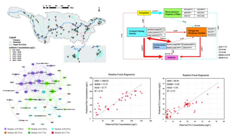 长江流域作为亚洲最大的河流流域,支流众多、人口与产业高度集聚,污染源类型复杂且环境因子多样,使抗生素的时空分布呈现显著差异。论文研究发现,长江流域抗生素总浓度为142.05–345.57 ng/L,氟喹诺酮类占比最高(75.68%),且长江中下游及主要经济带区域浓度相对更高,农业与畜禽养殖强度及氮、磷营养盐水平对长江流域抗生素浓度具有显著正向影响,同时抗生素浓度对水生态系统也产生潜在影响。长江流域抗生素的主要来源解析结果表明,畜禽养殖排放、水产养殖径流、医院医疗废水排放,污水处理厂尾水是主要来源,研究首次从全流域尺度系统识别整个长江流域抗生素的分布特征、关键驱动因素及主要来源贡献,研究结果为其他典型大尺度流域抗生素污染的风险评估、精准溯源与预测预警提供了参考与科学依据。(作者:张佳妹 一审:侯晓云 二审:黄健 三审:谢发之)