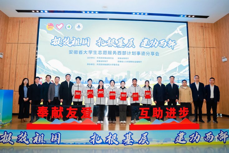 本网讯 为深入学习宣传贯彻党的二十大和二十届历次全会精神,弘扬“奉献、友爱、互助、进步”的志愿精神,引导广大青年学子投身基层、服务西部,近日,2026年“报效祖国 扎根基层 建功西部”安徽省大学生志愿服务事迹首场分享会在紫云路校区徽风楼二楼报告厅顺利举行。校党委书记马文革、团省委副书记周宇、校党委副书记李早,省教育厅、省财政厅、省人社厅,学校党委宣传部、教师工作部(人事处)、学工部(学生处)、团委相关负责同志出席活动。