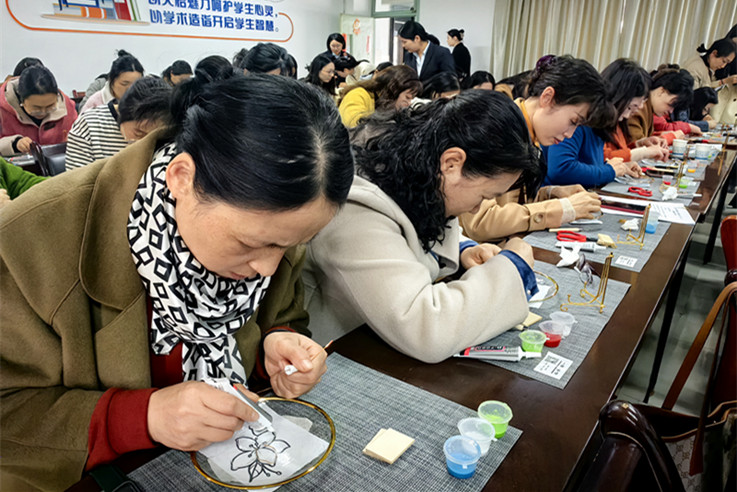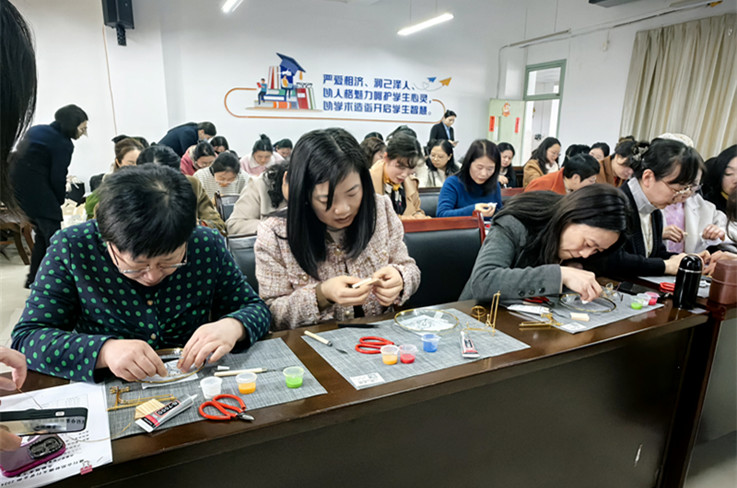 本网讯 春暖三月,芳华绽放,为弘扬中国传统工艺文化,带领女职工领略非遗之美,3月14日,三八节系列活动“巧手慧心润生活”掐丝珐琅手工制作活动在徽学楼1712室举行。活动由校工会女工委主办,外国语学院分工会承办,来自各基层分工会的女职工代表40余人参加,共同感受指尖上的艺术之美。