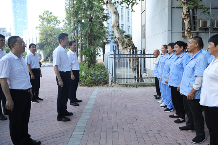 校领导一行先后来到紫云路校区徽弘门、15号学生公寓,玉兔餐厅、新南园餐厅建设工地,金寨路校区保卫处和绿化项目现场。每到一处,校领导都与大家亲切交谈,细致询问高温下的工作、生活情况,并送上防暑物资,感谢大家的辛勤付出与无私奉献。