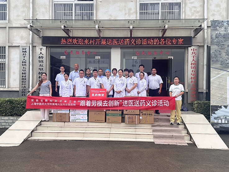 本网讯 9月18日上午,安徽省教科文卫体工会携手上海中医药大学附属曙光医院安徽医院来学校定点帮扶村——舒城县千人桥镇五里桥村,开展“跟着劳模去创新”送医送药义诊活动,捐赠价值五万元的药品和医疗设备。省教科文卫体工会副主席、二级调研员李晓燕,上海中医药大学附属曙光医院安徽医院党委组织员翟从永、工会主席江妍妍,校工会以及千人桥镇主要负责同志参加活动。