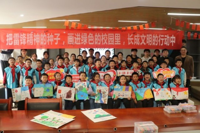 实践环节结束后,全体人员齐聚“一站式”学生社区开展主题学习交流。师生共同观看雷锋先进事迹纪录片与生态文明建设科普宣传片,结合影片内容畅谈感悟、交流心得,在思想碰撞中深化精神认知。随后,大学生与小学生组队执笔作画,以丹青绘心中雷锋模样。活动尾声,全体学子在“把雷锋精神的种子,画进绿色的校园里,长成文明的行动中”主题横幅上郑重签名,许下传承雷锋精神、共建文明校园的庄严承诺。
