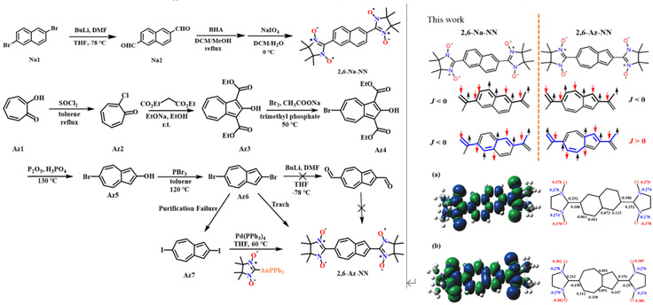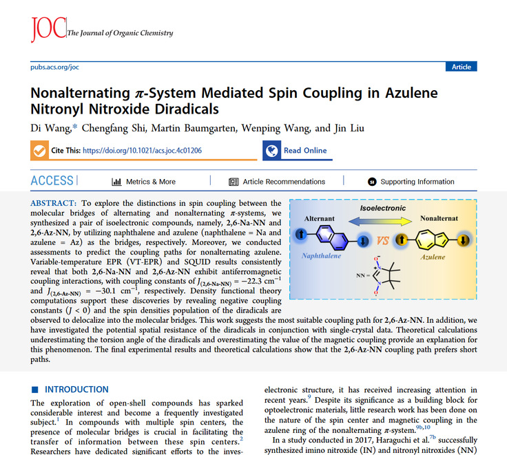 本网讯近日,beat365官网王帝副教授课题组在有机单分子磁体和超分子自组装聚积态磁体研究领域取得系列进展,相关三篇成果于2024年上半学年陆续刊登在美国化学会ACS的 The Journal of Organic Chemistry等期刊上。其中“Nonalternating π‑System Mediated Spin Coupling in Azulene Nitronyl Nitroxide Diradicals”是王帝、刘瑾老师及其研究团队成员以beat365在线唯一官网为第一完成单位与德国马普所高分子所Prof. Dr. Klaus Müllen(德国化学会主席,德国科学院院士,JACS副主编),Prof. Dr. Martin Baumgarten课题组及合肥工业大学王文平教授课题组合作完成。文中首次合成并探讨了交替共轭和非交替共轭的两种稠环芳香烃有机单分子磁体,在这种特殊共轭的桥连自旋磁性中心结构合成基础上,我们对其整体单分子磁性和自旋分布及分子内/分子间磁性中心的相互偶合方式及自旋磁性偶合常数的大小进行了全面的分析且使用电子自旋共振和超导量子干涉仪逐个进行测定和拟合。寻找到并量化了结构上交替共轭和非交替共轭介导的自旋磁性耦合的相关性。具体相关工作细节如下: