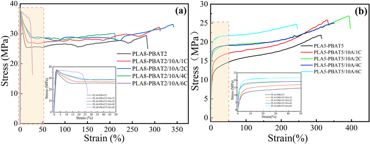 另外,作者通过对PLA/PBAT共混物相界面的调控和CNTs分散状态的改善,实现了在较高的填料含量材料韧性和阻燃性能的共同提升的技术效果。当聚磷酸铵含量为10 wt%, CNTs含量为6 wt%时,PLA5-PBAT5/10A/6C复合材料的断裂伸长率达到了245.9 %,缺口冲击强度为16.5 kJ/m2。此外,材料的热释放速率峰值(pHRR)和总放热率分别降至368 kJ/m2 和 72 MJ/m2。