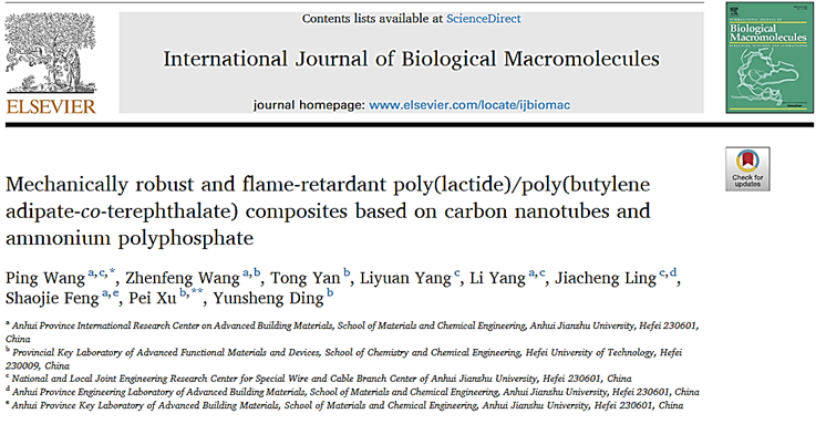 近日,beat365官网材料科学与化学工程学院本科生王振峰在其导师王平副教授的指导下,在国际著名期刊《International Journal of Biological Macromolecules》(IF=8.03,中科院1区(化学TOP期刊)上发表题为《Mechanically robust and flame-retardant poly(lactide)/poly(butylene adipate-co-terephthalate) composites based on carbon nanotubes and ammonium polyphosphate》(doi.org/10.1016/j.ijbiomac.2022.09.033.)的研究论文,该论文是王振峰同学本科毕业论文成果的总结和凝练。