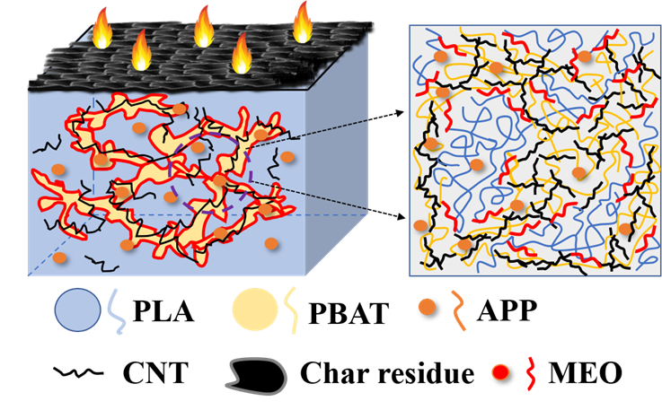 传统石油基高分子材料的大量使用导致的环境问题及 “双碳”要求逐步提高,促使可生物降解材料的应用范围逐步拓宽。其中聚乳酸和聚己二酸-对苯二甲酸丁二醇酯(PLA/PBAT)共混物凭借其独特的降解性能以及优异的机械性能是目前的工业开发的热点。为进一步扩展PLA/PBAT共混物材料在一次性消费电子领域的应用,研究团队持续开展了对PLA/PBAT共混物高性能化的研究。本工作中通过引入一种自主设计的多功能环氧低聚物(MEO,环氧当量值310)作为PLA/PBAT共混物基体的扩链剂,在加工过程中构筑了一种界面交联结构,有效增加了两相间的界面粘合力。同时,通过基体比例的调节,诱导了材料微观相形貌的转变,并以此达到通过基体调控碳纳米管(CNTs)分散的目的。