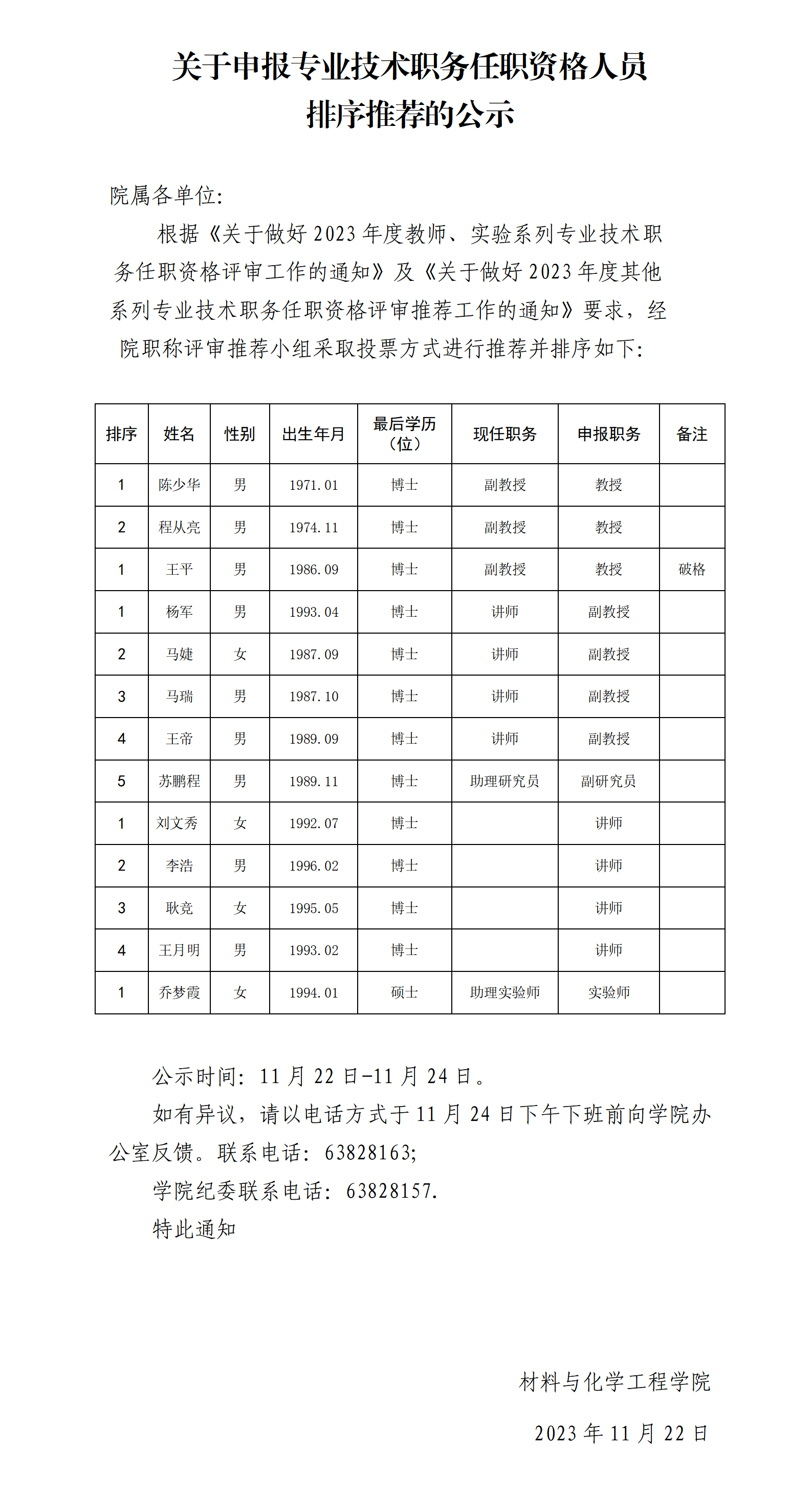 关于申报专业技术职务任职资格人员 排序推荐的公示