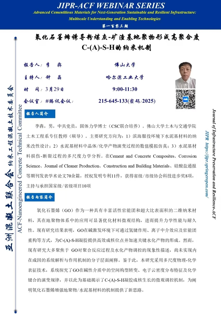 学术报告:氧化石墨烯诱导粉煤灰-矿渣基地聚物形成高聚合度C-(A)-S-H的纳米机制