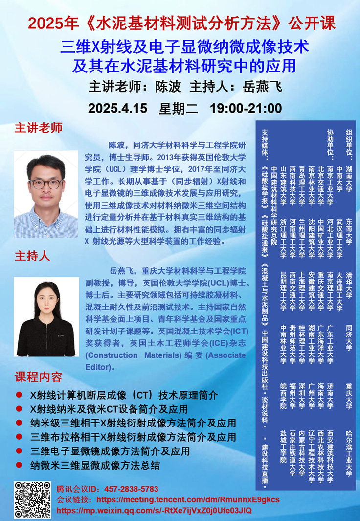 2025年《水泥基材料测试分析方法》公开课——三维X射线及电子显微纳微成像技术及其在水泥基材料研究中的应用