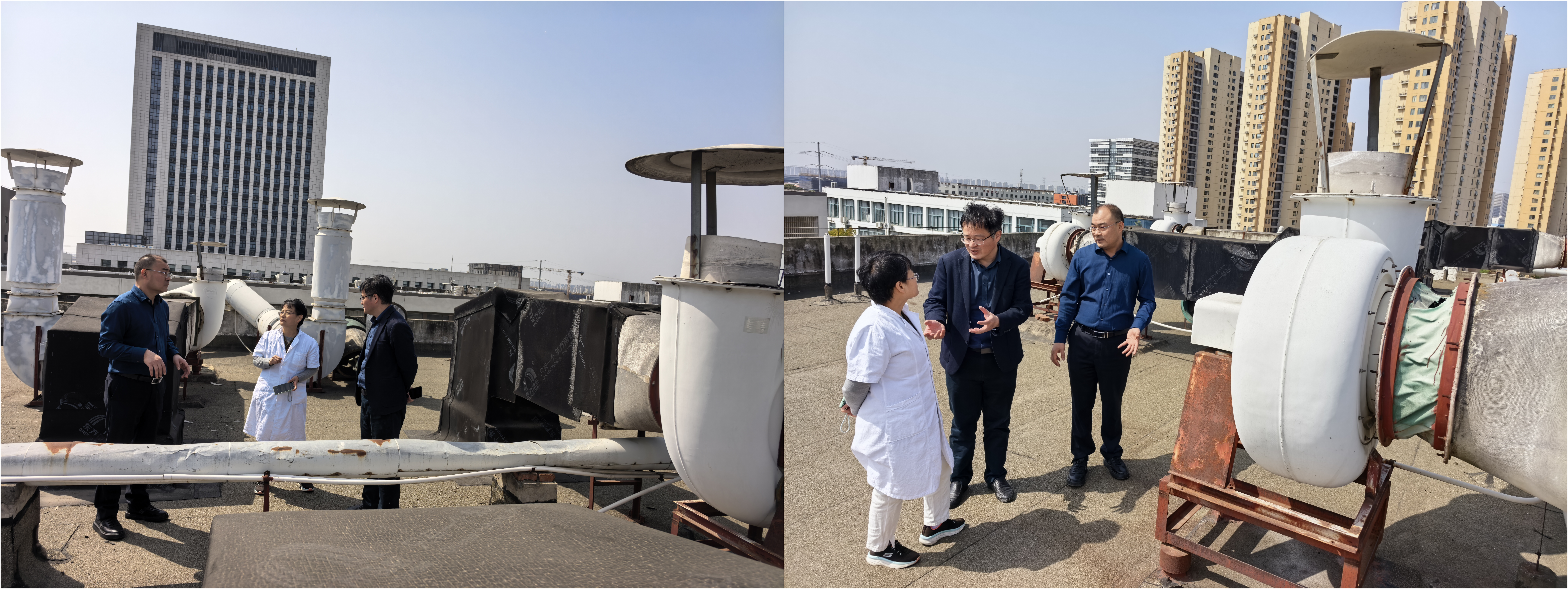 4月3日,学院领导班子带队对徽文楼通风管道运行情况展开专项检查,与实验室管理人员交流日常维护管理细节。经检查发现,由于实验室通风系统使用频率高、年限久,多路系统出现功能性问题:楼顶通风软连接破损严重,一台风机故障停运,二楼至三楼8间实验室的通风罩口积满灰尘。这些问题直接减弱了通风效果,实验废气无法及时排出,实验室内气味浓重,不仅影响师生健康,更造成严重的安全隐患。