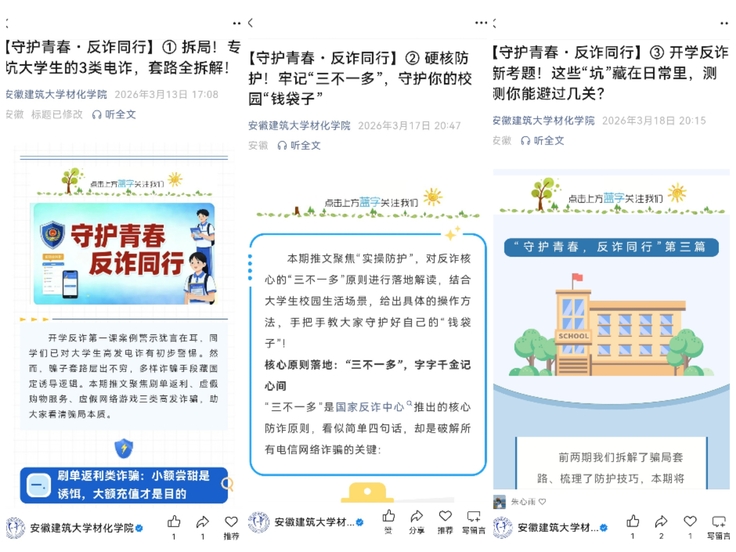 各班级组织召开主题班会,辅导员紧扣校园高发诈骗类型,围绕刷单返利、冒充公检法、校园贷、兼职刷单、游戏交易等学生易受骗场景,通过真实案例剖析、套路拆解、风险提示等方式,让学生们清晰认清诈骗手段与危害。学院微信公众号以“守护青春•反诈同行”为主题发布系列推文,深入剖析诈骗分子的惯用伎俩、话术套路与隐蔽手段,用通俗易懂的语言讲解识骗技巧、防骗要点和应急处置方法,实现宣传教育全覆盖、无死角。