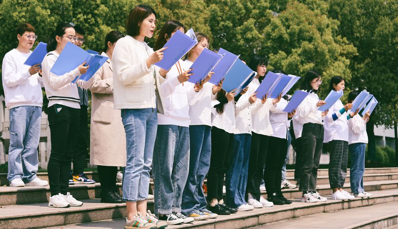 主教楼前,党员们胸戴党徽,手捧党史,一个个精神饱满,神采奕奕,用嘹亮的声音激情诵读,激扬顿挫的诵读声中饱含了新时代青年党员对中国共产党的崇敬之意,对伟大祖国的感恩之情。