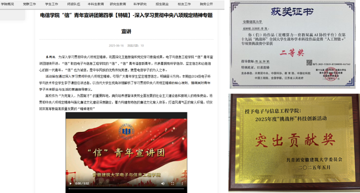 筑牢双创体系,提升学生培养质量。学院始终重视学生创新能力的培养,积极组织学生参与各类科技创新比赛,取得丰硕成果。获创新创业类比赛国家级银奖1项、铜奖2项,省级金奖2项、银奖5项,立项“大创”国家级项目10项,学院团委荣获校“挑战杯”大赛突出贡献奖。弘扬时代精神,打造特色活动亮点。学院创新打造的“‘信’青年宣讲团”品牌活动,面向全院师生成功举办6期宣讲,以青年视角生动诠释红色故事。同时,学院精心策划美育品牌活动,包括“红歌汇美育展演”和“草坪音乐节”,进一步丰富实践育人载体。