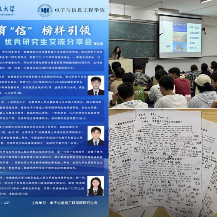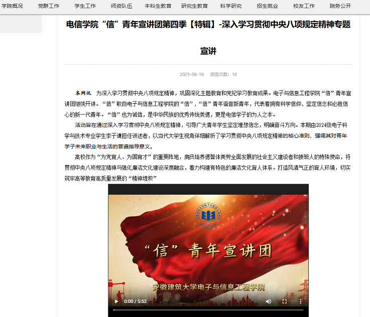 守正创新育新人,价值引领树新风。学院以宣讲赋能传声、红色基因润心为抓手,扎实推进价值引领工作:打造“信”青年宣讲团,围绕党的创新理论、红色经典故事开展16场专题宣讲;利用暑期组织学生赴新四军四支队旧址、金寨县革命博物馆等红色教育基地,开展沉浸式党性教育实践。深化思政育人融合,结合“学思践悟党的二十大 五育并举育新人”主题,与马院开展“课程思政”与“思政课程”联合共建;组织学生参与学校“红色演说家——讲述红色建筑背后的故事”赛事,斩获一等奖1项、二等奖2项、三等奖1项及优秀组织奖。强化廉洁文化涵养,开展“廉洁文化基层行”、组织观看反腐纪录片等活动,引导师生知敬畏、守底线,着力营造风清气正的育人环境。
