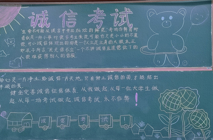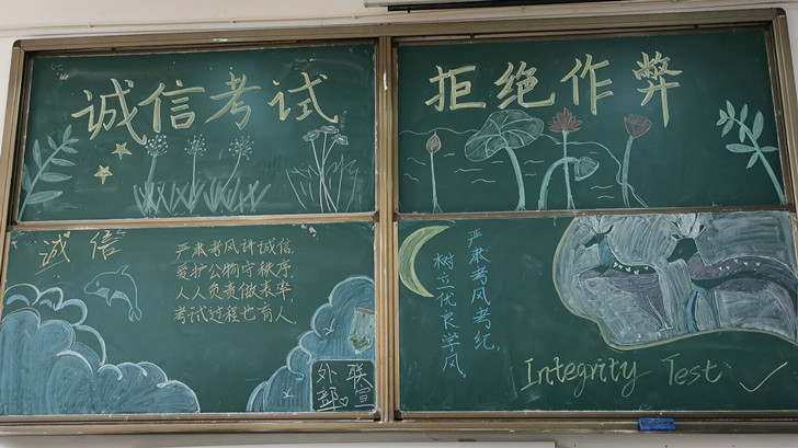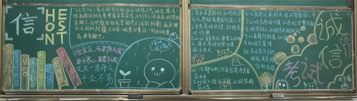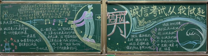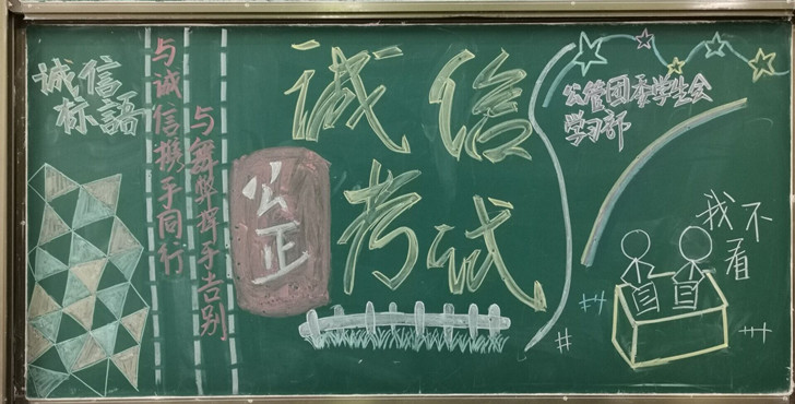 本次活动由院学生会主办,各部门积极参加、精心准备、团结协作、认真设计,将自己对诚信考试的态度,表达在黑板报的一笔一划中。黑板报内容主题鲜明、创意新颖、版面布局工整。经过认真评比,最终纪检部设计的黑板报拔得头筹,夺得第一名!