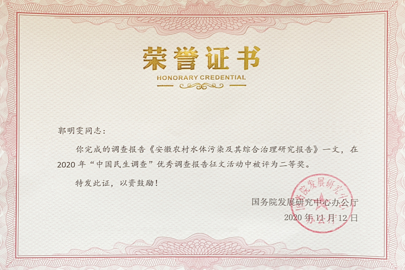 2018级城市管理专业郭明雯同学撰写的《安徽农村水体污染及其综合治理研究报告》一文获优秀调查报告二等奖,2018级城市管理专业许东辉、吴春宏同学撰写的《教育——乡村振兴的未来》、陈阳阳同学撰写的《坚韧生长:疫情下的农户就业》两份报告获三等奖。袁海枫、李敏、刘可榕等13位同学获得国务院发展研究中心办公厅颁发的“优秀调查员”称号。