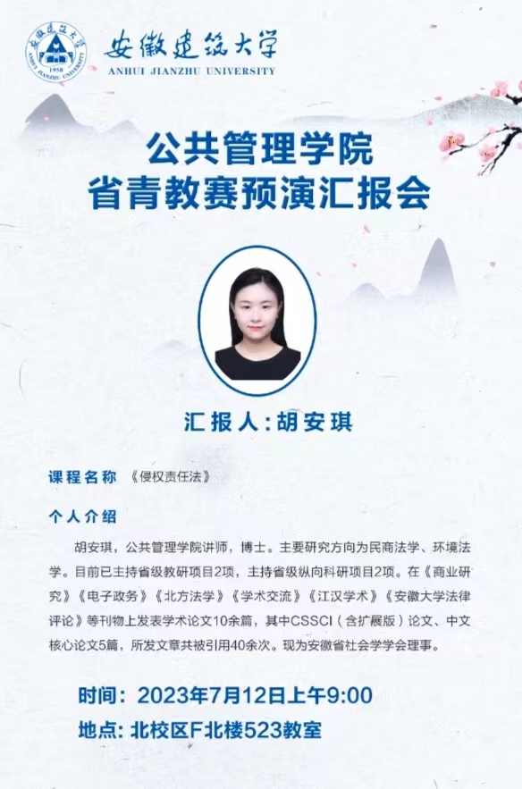 本次预演汇报完全按照安徽省青教赛赛制要求进行,参赛教师需准备8个参赛备选模块,评委随机抽选1项作为讲授内容,教师由此展开教学。学院青年教师胡安琪博士本次讲授的内容为《侵权责任法》课程教学片段“产品缺陷责任的承担方式”,借助现实案例“TESLA刹车失灵纠纷”进行课堂导入,通过在线互动方式把知识讲解融汇在师生对法条规定、规则的适用和现实案件的判罚的研讨之中。20分钟的教学展示,条分缕析,言之有序。