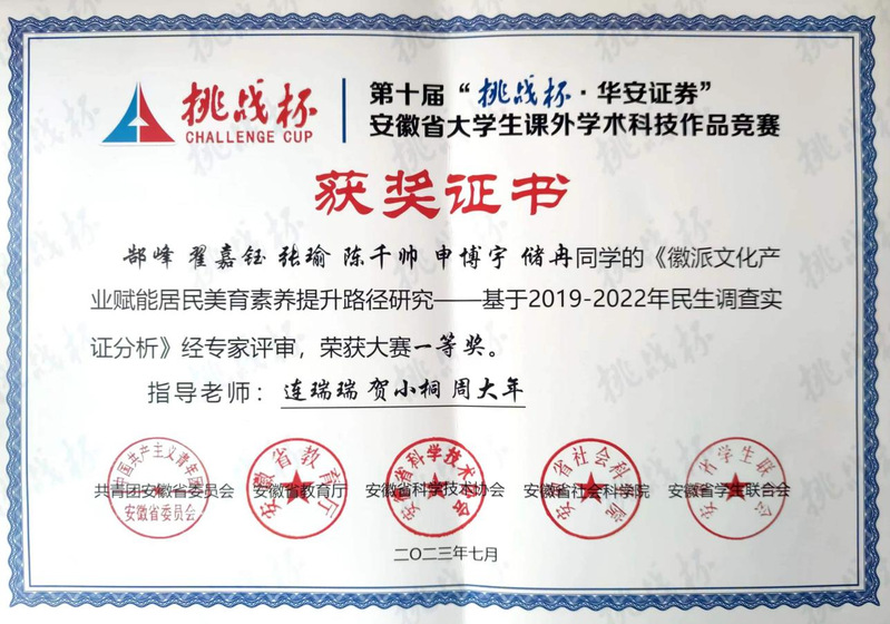本网讯2023年10月30日,共青团中央、中国科协、教育部等主办的第十八届“挑战杯”全国大学生课外学术科技作品竞赛终审决赛在贵州大学圆满落幕,beat365官网公管学院《徽文化产业赋能居民美育素养提升路径研究》项目团队荣获全国三等奖。