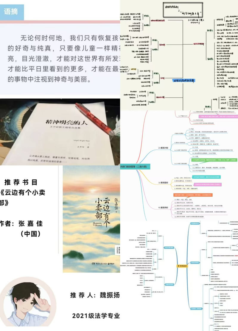微书评活动以新颖的“微”概念+书评的方式展开,受到了同学们的广泛关注和热情参与。活动经过投稿、遴选,通过“安建大公小管”公众号展示学生们对阅读满腔热情的书评,让广大师生感受书籍的魅力,实现“以书怡情、以书启智、以书育人”的教育目标;思维导图绘制大赛采用线上线下结合的方式开展,公收到学生56份作品。比赛通过两轮筛选,评选出五位一等奖作品,观其思维导图,学科内容详略得当,布局巧妙别致。思维导图大赛的开展不仅助于同学们将隐性知识显性化,将言语信息图像化,还能够帮助同学们系统地构建完整有效的知识网络系统,改进学习方法,提高学习效率。