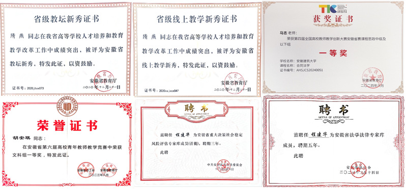 法学专业师资团队年龄结构、学历结构、学缘结构合理,“双师型”教师占比80%。拥有教育部、司法部“双千人才”2人,安徽省教学名师1人、教坛新秀3人,安徽省法学法律专家库成员2人、安徽省重大决策社会稳定风险评估专家库成员1人、安徽省网络法治专家库成员1人、安徽省土地法治专家库成员1人,1人入选安徽省优秀青年教师培育项目,3人入选省校级各类优秀人才培养项目。教师教学能力突出,获全国高校教师教学创新大赛安徽赛区一等奖4项、二等奖2项,安徽省青年教师教学竞赛一等奖1项,学校教学竞赛奖项10余项。