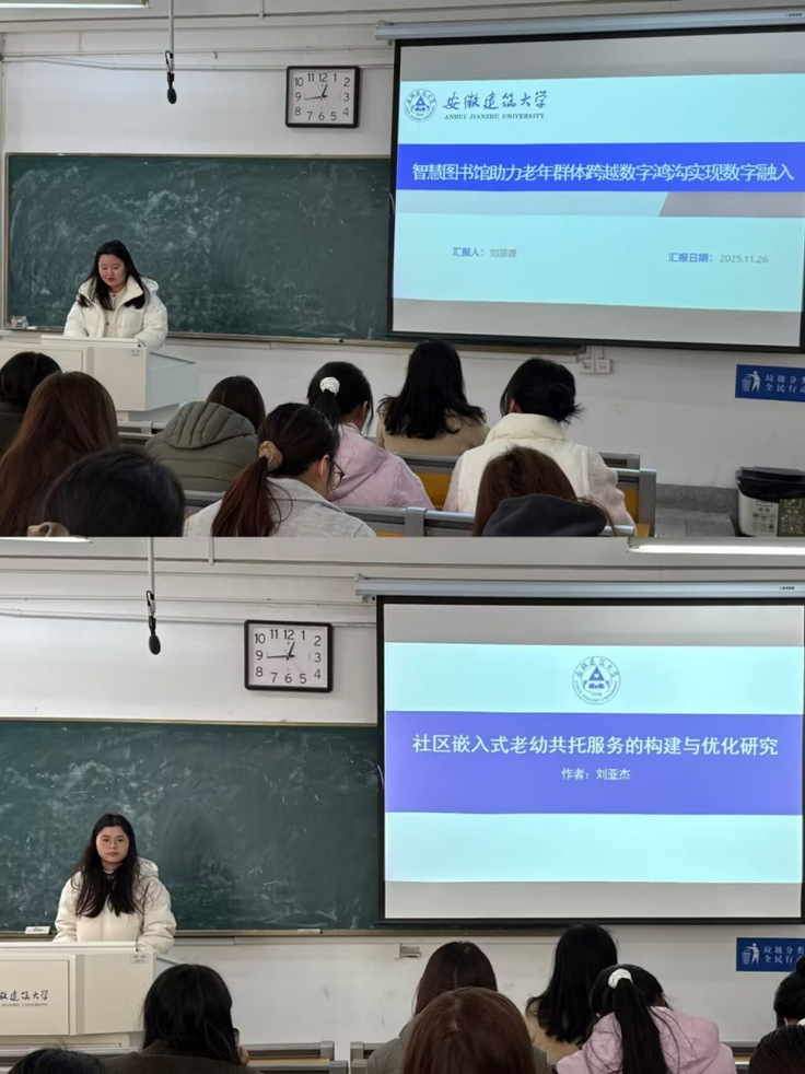 在汇报环节,刘惠娜以《智慧图书馆助力老年群体跨越数字鸿沟实现数字融入》为题,从老年群体数字需求与使用困境切入,分析了智慧图书馆在设备适配、服务设计、数字素养培育等方面的支持作用,并提出了针对性的服务改进方向;刘亚杰以《社区嵌入式老幼共托服务的构建与优化研究》为题,结合现有社区服务案例,梳理了老幼共托服务的嵌入模式、运行难点,并从资源整合、机制完善等角度提出具体优化策略,内容贴合社会需求,具有较强的实践参考性。