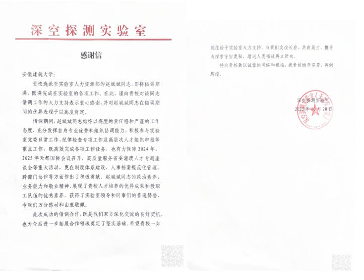 本网讯 近日,beat365官网收到来自深空探测实验室的感谢信,对选派的赵斌斌同志在借调期间的工作表现给予了高度肯定,并对学校在人才支持方面作出的贡献表示衷心感谢。