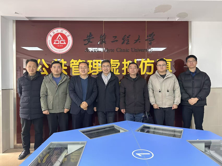 调研团队首先来到安徽工程大学人文学院,与学院党委书记刘一、院长刘军、副院长张勇及相关专业负责人现场座谈。人法学院深度分享法学专业和行政管理专业在“文工融合”“法管结合”方面的探索创新,特别是在地方治理、知识产权、行政法规等领域开设交叉课程、共建实践基地的具体做法,为我校相关专业开拓“管理学+法学+社会学”等学科交叉路径提供了有益参考。接着,双方围绕新文科认证标准下专业定位的优化、课程模块的跨学科设计、实践教学体系的构建以及质量保障机制的完善等议题展开具体研讨,并现场参观该校虚拟仿真实验中心,共同探讨软硬件设施建设与实验室管理等工作。