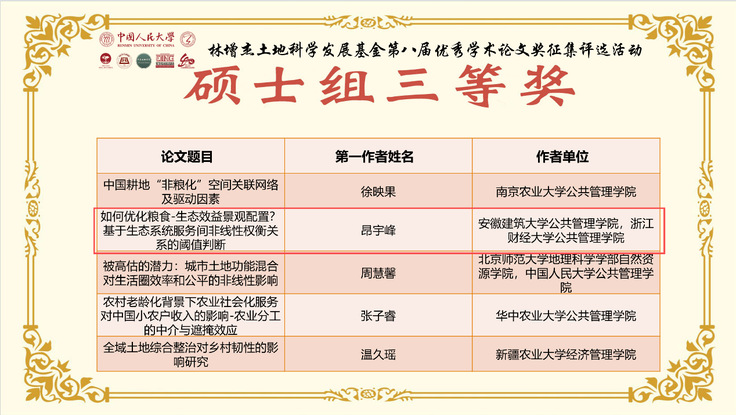 本网讯 近日,由中国人民大学公共管理学院、林增杰土地科学发展基金会与《中国土地科学》编辑部共同主办的“中国人民大学林增杰土地科学发展基金第八届优秀学术论文奖征集评选活动”圆满落幕。在学院王玉纯老师的指导下,2023级公共管理硕士生昂宇峰撰写的论文《如何优化粮食-生态效益景观配置?基于生态系统服务间非线性权衡关系的阈值判断》荣获硕士组优秀论文三等奖。