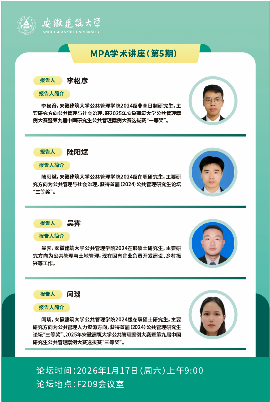 在报告分享环节,李松彦以《基层警察压力成因与应对策略研究——以H市X所为例》为题,从三类压力维度剖析基层警察困境,构建协同治理体系,为公安管理部门优化制度、提升效能提供支撑。陆阳斌以《优质均衡背景下县域农村小学课后服务质量提升路径研究——以S县H镇为例》为题,针对县域农村小学课后服务师资短缺、资源不足等痛点,创新提出本土资源赋能协同多元主体思路,开发农业民俗特色课程,明确家校社协同路径。吴霁以《新站区三十头社区全域土地综合整治谋划方案》为题,以农旅融合典范为目标,提出小田变大田、产业导入等措施及三类安置方案,兼顾耕地保护、农民增收与生态底线。闫琰以《普通高校本科毕业生慢就业问题的协同治理研究》为题,聚焦合肥市慢就业率攀升现状,以重点产业链人才服务机制为案例,厘清群体特征与成因,为政府优化就业政策提供实证参考。