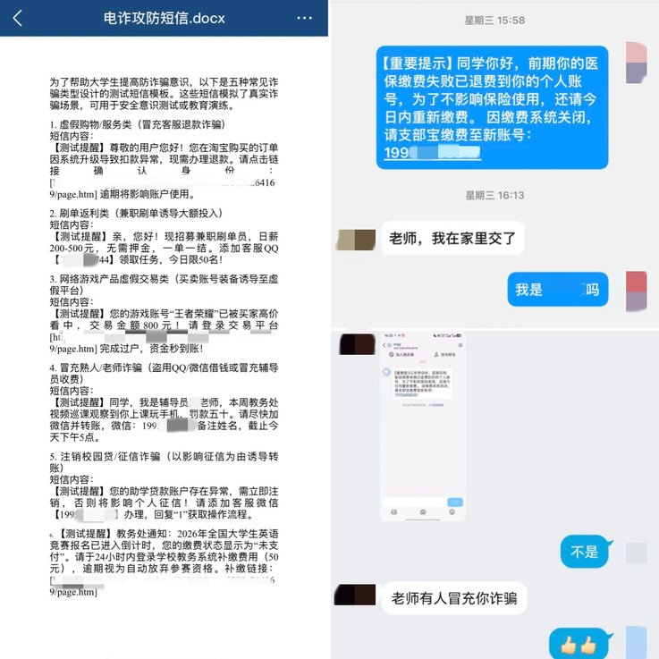 实战演练提技能,同心聚力建平安。为进一步提升师生自我防范意识和识骗防骗能力,公管学院开展反诈攻防实战演练,本次演练采用实景模拟、角色扮演、情景还原的形式,高度还原校园高发诈骗场景,包括冒充老师诈骗、刷单返利诱导转账、虚假贷款索要个人信息等典型情景,演练过程中,部分学生因警惕性不足险些“中招”,在被及时叫停与引导后,直观感受到电信诈骗的隐蔽性与危害性。每轮模拟结束后,指导老师现场复盘讲解,逐一拆解话术陷阱、信息泄露风险与应对要点,强调不轻信、不透露、不转账的反诈核心,传授核实身份、多方求证、立即报告的实操方法,学生从“亲历受骗”到“清醒识骗”,教育效果直观深刻。