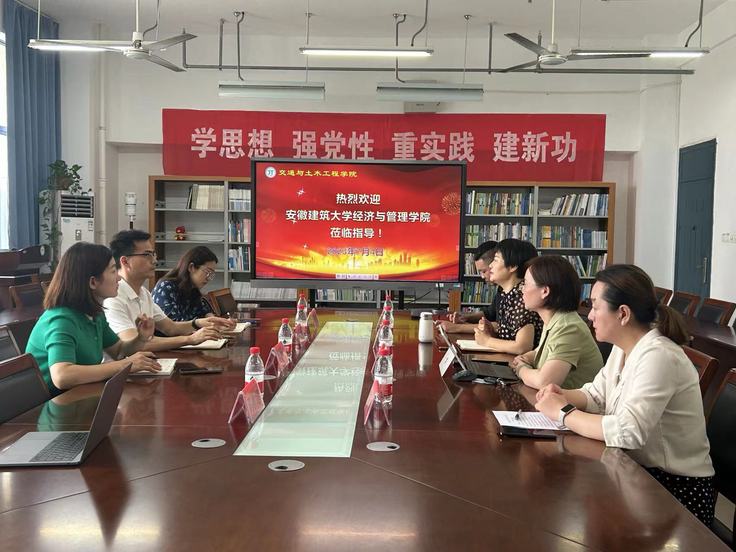 本网讯 为深入推进学院一流专业建设和工程管理专业工程教育认证工作,7月4日,经管学院院长彭志胜、副院长章蓓蓓带队,工程管理系主任杨苏、副主任马晋超一行前往江苏南通大学交通与土木工程学院调研交流。调研组一行受到南通大学交通与土木工程学院党委书记张莉莉、副院长陈敏等热情接待,南通大学交通与土木工程学院工程管理系主任许薇、专任教师王轶等参加交流。