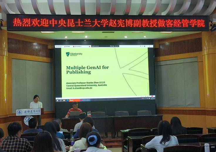 本网讯 5月12日,澳大利亚中央昆士兰大学博士生导师赵宪博副教授应邀到经管学院举办题为“Multiple GenAl for Publishing”(多种生成式人工智能辅助高水平论文写作)的专题讲座。讲座由经管学院副院长章蓓蓓主持,学院教师、硕士研究生共80余人参加。