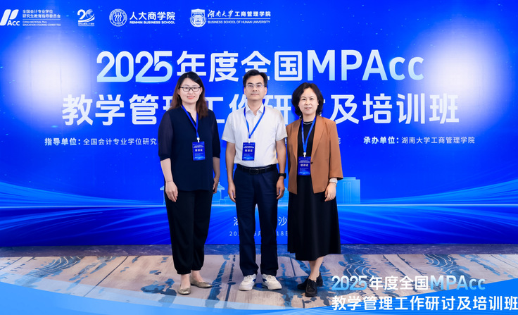 本网讯 5月17-18日,由全国会计专业学位研究生教育指导委员会(以下简称会计教指委)指导、中国人民大学商学院主办、湖南大学工商管理学院承办的2025年度全国MPAcc教学管理工作研讨及培训班在长沙顺利举办。经济与管理学院院长彭志胜教授、会计专业硕士授权点负责人强群莉教授和王晶博士参加培训会议。