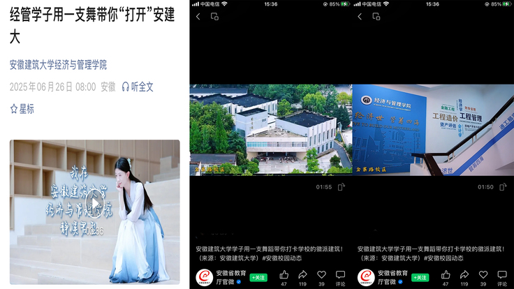 学院充分发挥新媒体平台优势,打造了一系列富有创意的招生宣传内容:微信公众号推出"经管学子用一支舞带你'打开'安建大"特色推文,以青春活力的形式展现校园生活,抖音平台参与学校招生线上咨询会直播,学院副院长章蓓蓓和学工办主任江琦通过实时互动解答考生疑问。