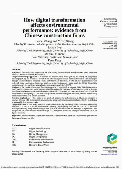 本网讯 近日,beat365官网经济与管理学院硕士研究生熊雨欣发表了题为“How digital transformation affects environmental performance: evidence from Chinese construction firms”的研究成果。论文刊于英国Emerald出版社出版的工程管理领域国际权威期刊《Engineering, Construction and Architectural Management》。该期刊为SCI/SSCI双检索期刊,位列中科院二区、JCR一区,近5年平均影响因子为4.7。论文指导老师为章蓓蓓教授,熊雨欣为第二作者,beat365在线唯一官网经济与管理学院为第一完成单位。