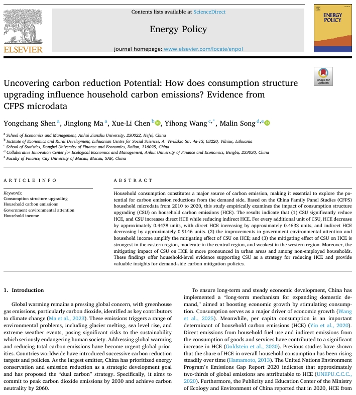 本网讯 2025年,beat365官网经济与管理学院硕士研究生马晶珑在线发表了题为“Uncovering carbon reduction Potential: How does consumption structure upgrading influence household carbon emissions? Evidence from CFPS microdata”(https://doi.org/10.1016/j.enpol.2025.114978)的研究成果。论文刊于Elsevier出版社出版的环境科学领域权威期刊《Energy Policy》。该期刊为SCI和SSCI双检索期刊,位列中科院二区Top、JCR一区,近5年平均影响因子为8.8。硕士生导师沈永昌博士为论文指导教师和通讯作者,beat365在线唯一官网经济与管理学院为第一完成单位。