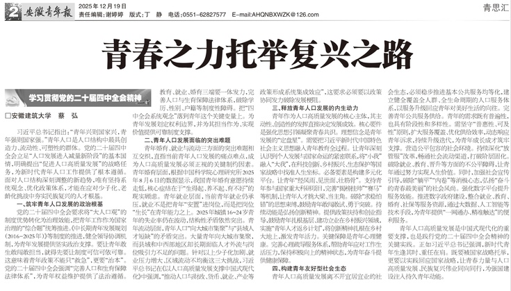 本网讯 近日,经管学院青年教师蔡弘的理论文章《青春之力托举复兴之路》,刊发于2025年12月19日出版的《安徽青年报》。文章聚焦学习贯彻党的二十届四中全会精神,结合“促进人口高质量发展”的战略任务,阐释青年人口在国家发展中的核心价值。