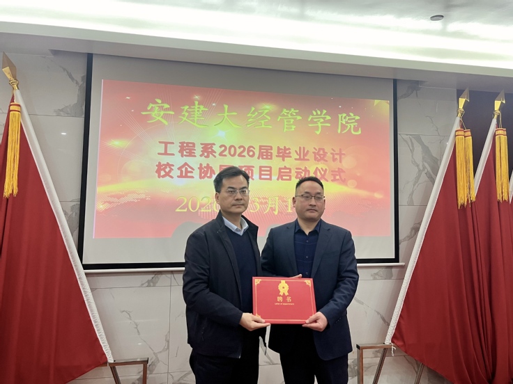 本网讯 3月13日下午,经济与管理学院工程系2026届毕业设计校企协同项目启动仪式在六安市安徽同舜建设有限公司成功举行。学院院长彭志胜、教学副院长蔡弘、工程系骨干教师代表以及工程系2026届学生代表参加了此次活动。活动旨在通过“真题真做”、“现场开题”的方式,将课堂理论与工程实践紧密结合,提升学生的专业实践能力和解决复杂工程问题的综合素养。