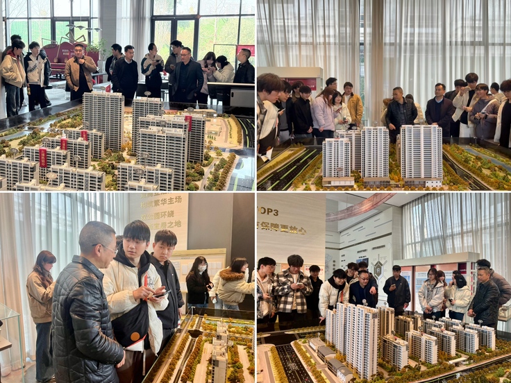 启动仪式结束后,全体师生前往“君逸府”项目现场,开启了本次活动的第二阶段——实地参观与现场开题。在项目售楼部,赵志年导师结合沙盘模型,生动讲解了项目的整体规划、设计亮点与市场定位,学生们兴致高昂,积极提问并记录,现场互动频繁,气氛热烈。