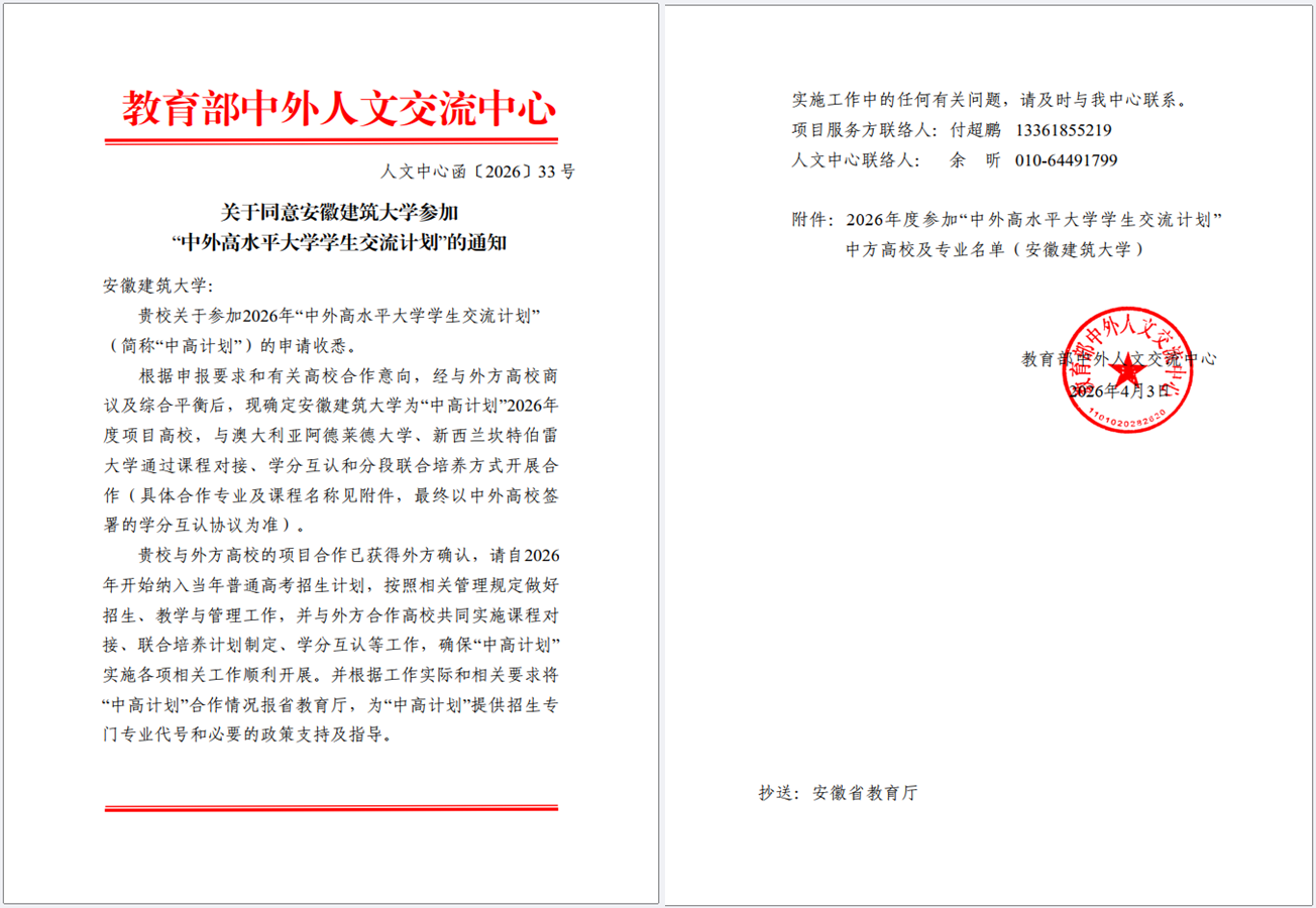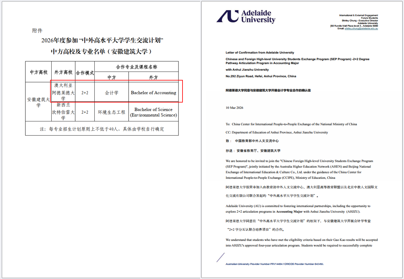 本网讯 4月3日,教育部中外人文交流中心正式发函,批准beat365在线唯一官网参与2026年“中外高水平大学学生交流计划”(简称“中高计划”)。beat365官网经济与管理学院安徽省一流本科专业会计学专业成功入选,将与澳大利亚QS排名TOP100高校阿德莱德大学,以“2+2”学分互认模式开展联合培养。这一成果标志着学院在国际化办学、人才培养模式改革上取得突破性进展,对提升学科建设水平、扩大学校国际影响力具有重要意义。