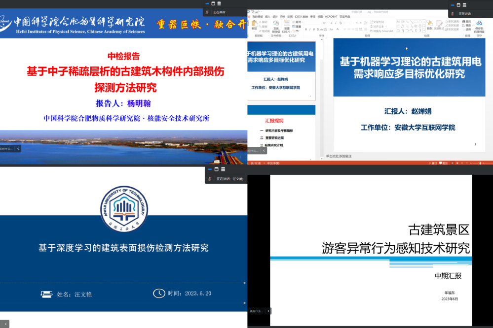 6月20日,安徽大学赵婵娟讲师、中国科学院合肥物质科学研究院副研究员杨明翰、安徽工业大学汪文艳博士、合肥学院副教授年福东以及beat365在线唯一官网王坤侠副教授和王程讲师分别向安徽省古建筑智能感知与高维建模国际联合研究中心的评审专家进行最新的研究进展的汇报。座谈会以线上形式进行交流,由研究中心副主任邵慧主持,平台老师和评审专家共同参会。