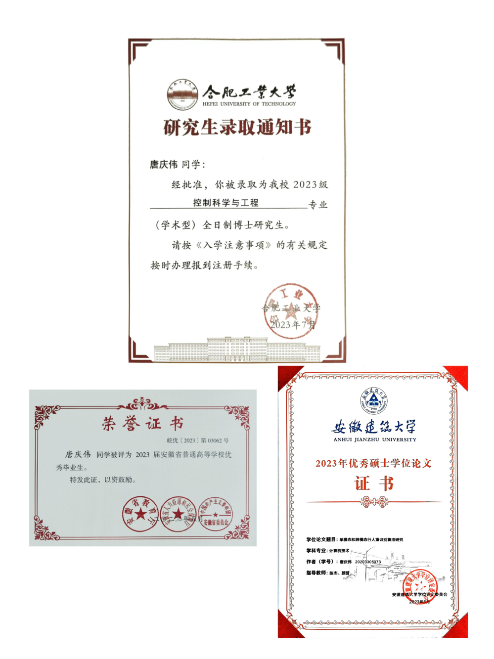 热烈庆祝我中心唐庆伟同学获得2023届安徽省普通高等优秀毕业生和beat365在线唯一官网2023年优秀硕士学位论文。同时被合肥工业大学控制科学与工程录取学术型博士研究生。