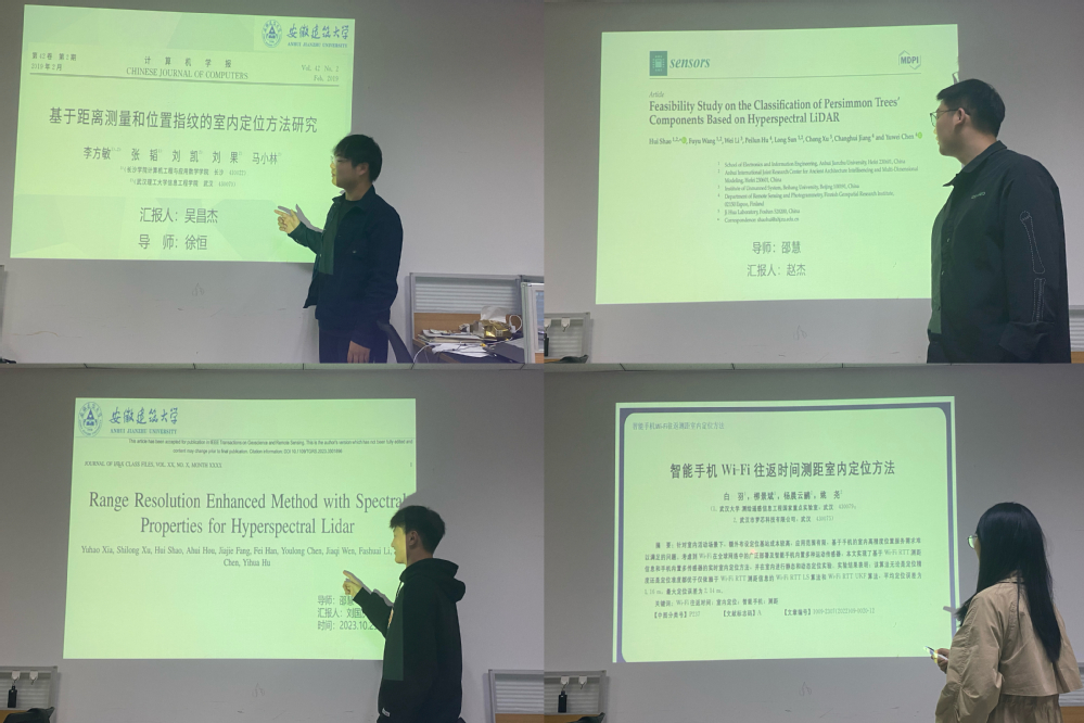 10月25日下午研究中心在实验综合楼608举办小型研讨会。来自研一的四名同学分别汇报各自领域的研究内容。刘国庆同学和赵杰同学汇报了关于高光谱激光雷达应用的研究成果,胡蝶同学和吴昌杰同学汇报了关于室内定位方向的算法研究。