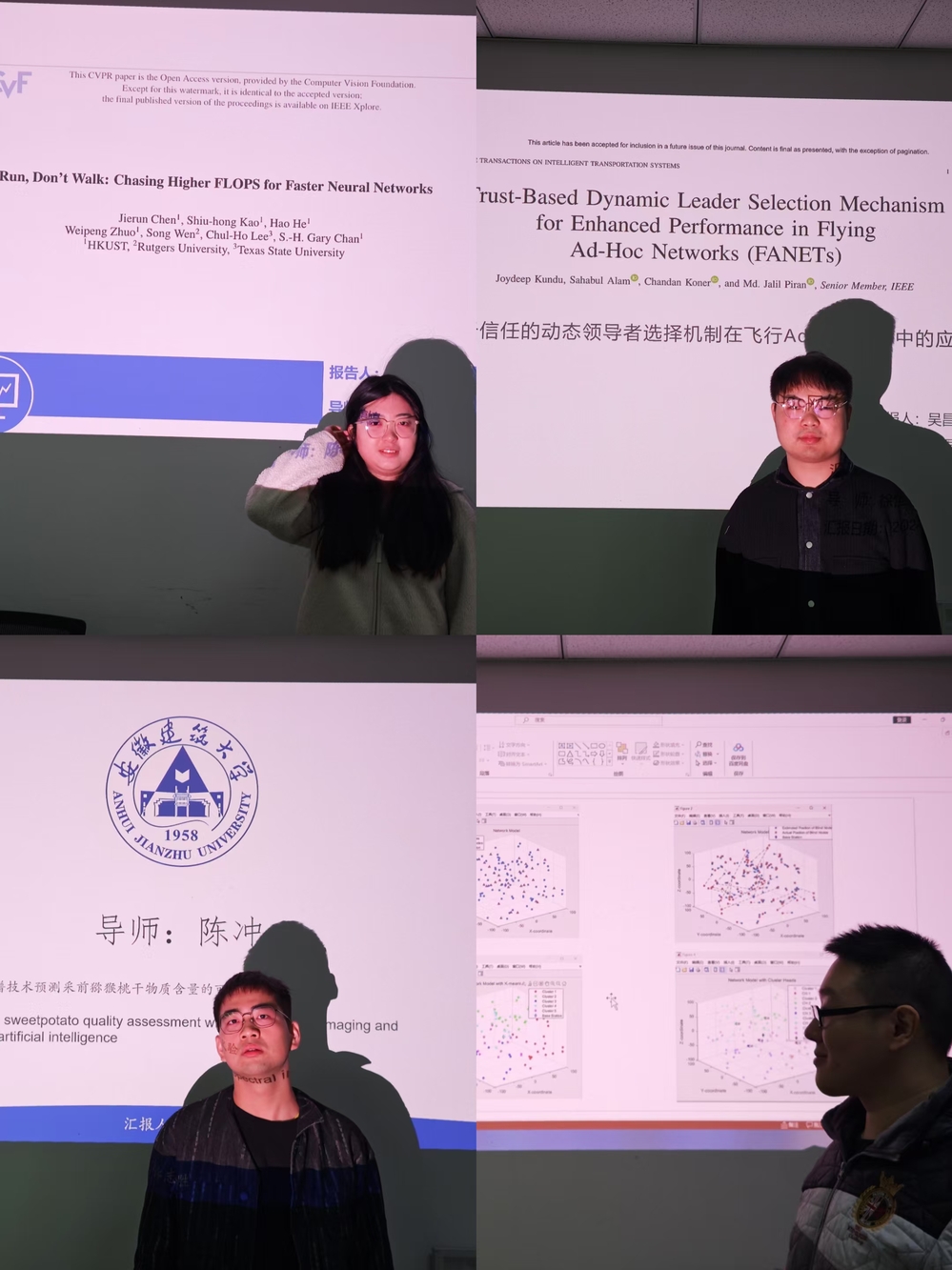 12月18日中午,安徽省古建筑智能感知与高维建模国际联合研究中心在徽风楼608办公室举办了一场内容丰富的小型研讨会。此次会议汇聚了研究中心的师生团队,由四名研二研究生——朱婷婷、朱吉雨、吴昌杰和许志胜——围绕各自的前沿研究成果进行精彩汇报,展示了最新的研究动态和技术进展。