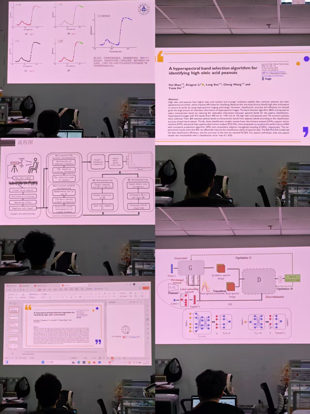 接着,盛宇宏同学汇报了用于识别高油酸花生的高光谱波段选择算法的相关论文,论文通过使用名为“波段迭代算法”(BIA)的新型波段选择方法,提高了高油酸花生的分类精度。最后,黄书龙同学汇报了使用CCGAN网络进行回归的数据增强方法及其在改进光谱感知中的具体应用。
