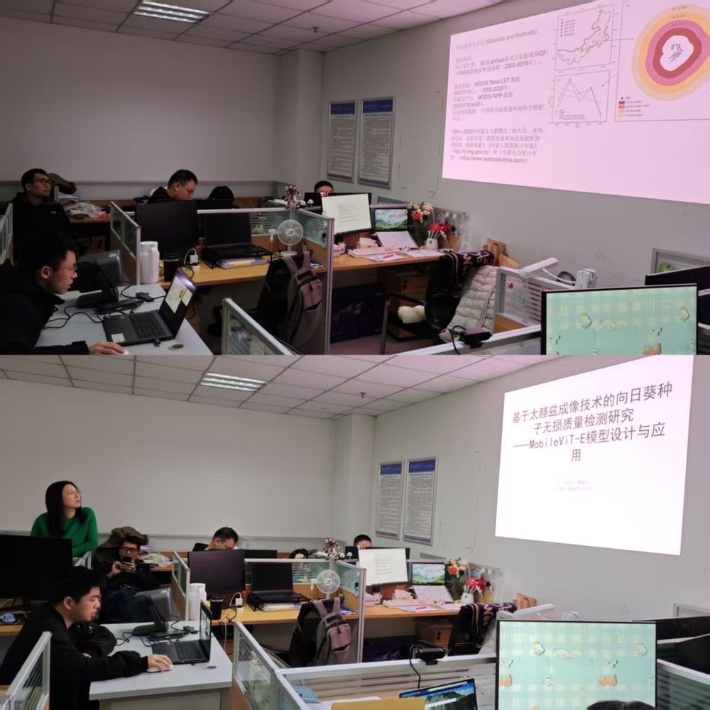 总体来看,本次研讨会从电池多物理场仿真、多模态预训练模型设计,到太赫兹成像在农产品质量检测中的应用,再到遥感视角下风电场生态效应评估,涵盖了方法论创新与工程实践的多个层面。几位同学在汇报中注重将理论模型与实际场景紧密结合,通过仿真、算法与数据分析相互印证,体现出中心研究生在交叉问题识别、技术选型与结果解读方面不断增强的综合研究能力。