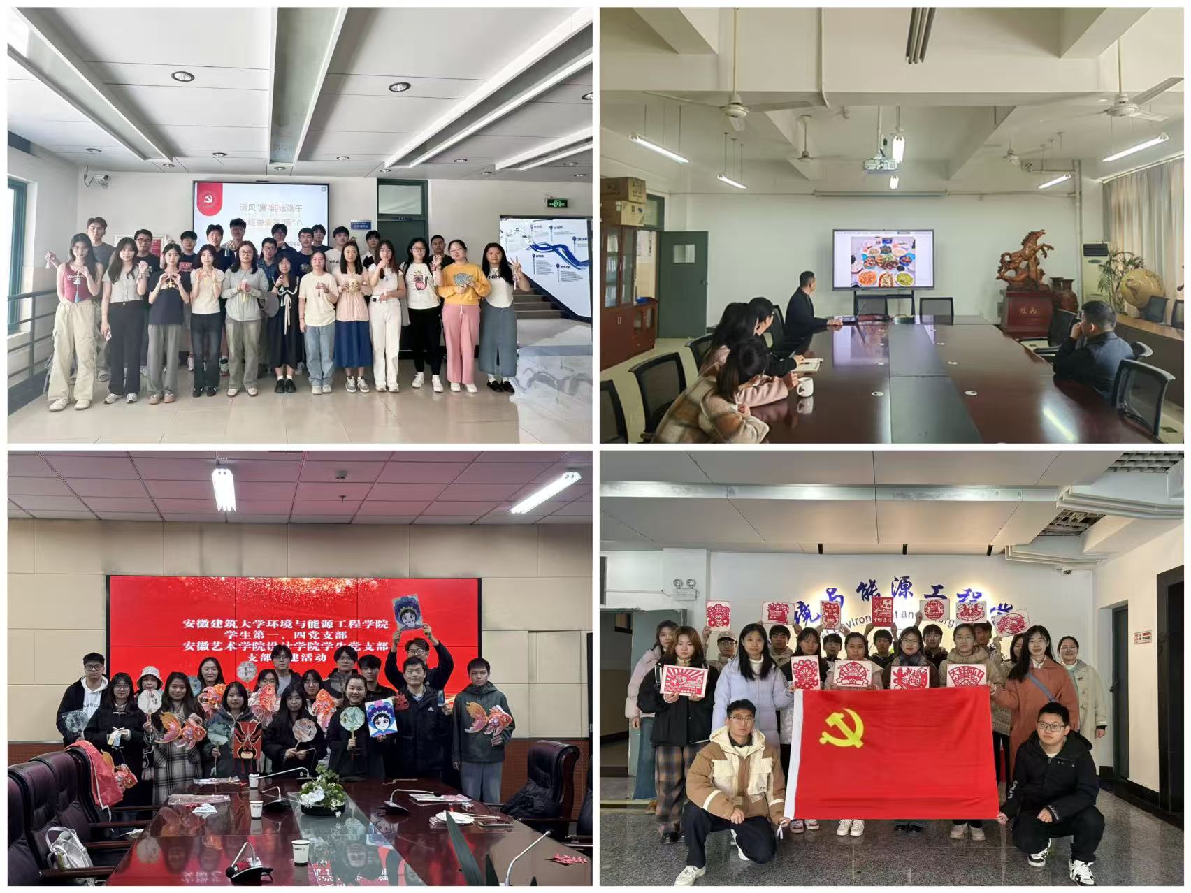 中华优秀传统文化中华民族的精神命脉,是涵养社会主义核心价值观的重要源泉。为增进学生党员对中国传统文化的了解,感受中国传统文化的魅力,自觉传承弘扬中华优秀传统文化,环能学院学生党支部积极借助传统佳节,开展文化传承活动。学院连续多年在寒假期间通过易班线上思政平台,结合当前国家大事开展不同主题的“寻味中国年”活动,无论是“寻味中国年 ‘易’起奔小康”还是 “寻味中国年 ‘易’起贺新春”,都鼓励学生们在家乡民俗中感受中华优秀传统文化的魅力。端午佳节,学生第一党支部开展清风“廉”韵话端午,巧缝香囊寄“廉”心主题党日活动,把廉政教育和传统习俗相结合,以“春风化雨润无声”的方式,弘扬屈原风骨,涵养清风正气,持续推动廉洁文化建设。研究生专硕党支部将徽文化与端午传统文化相融合,在学校南校区徽州建筑区举办“徽风拂建大,皖韵乐端午”端午节文化体验活动。在非遗传承中,环能学院学生第一、四党支部积极与安徽艺术学院设计学院非物质文化遗产保护专业学生支部开展支部共建,在非遗专业同学的指导下,沉浸式体验剪纸、脸谱、鱼灯等非遗项目的魅力,感受传统工艺的精妙与厚重。学生第五党支部组织开展“红色剪纸颂党恩”主题党日活动,让大家在对剪纸技艺的学践过程中,感悟党的丰功伟绩,诉说爱党情。